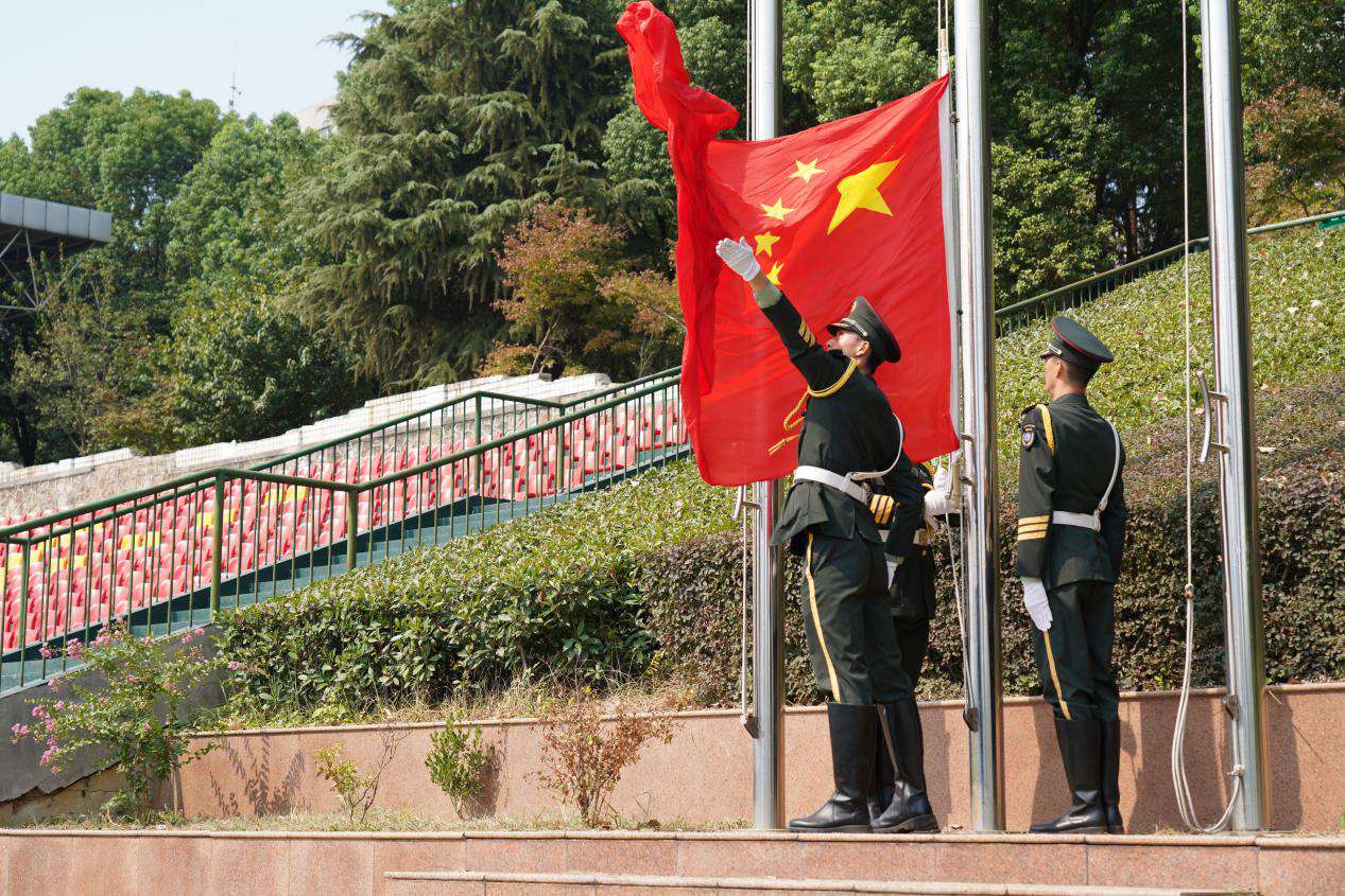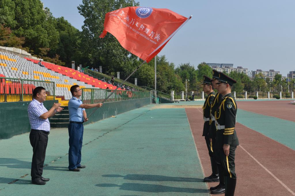 马蜂书记从国旗仪仗队队员手中接过校旗,授予承训部队总指挥刘飞教导员,并宣布:“2019级新生军训开营!”