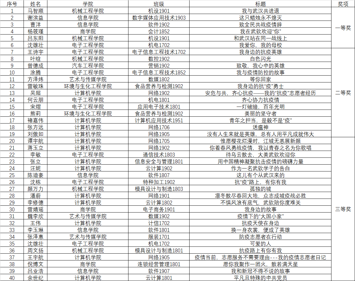 为进一步弘扬“抗疫”精神,鼓舞和带领全校师生同心战“疫”,共克时艰,学校面向全校学生举办了“抗‘疫’路上,有你有我”主题征文比赛。本次征文比赛为期20天,分为“我和‘新冠’不得不说的故事”“我身边的抗‘疫’勇士”“我在武软欢迎‘你’”三个主题。