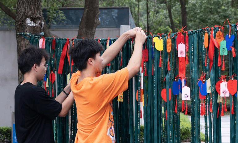“殷勤寄语同袍者,努力磨教铁砚穿。”“笺纸”之作,自唐朝开始,记录着千年文化。来到体育学院负责的祈福打卡处,只见师生们纷纷在心愿卡片上写下自己的愿望与祝福,将它们悬挂在祈愿带上。一张张小小的卡片,承载着大家对生活的热爱与感悟,大大小小的祝愿汇聚成一张祈愿“网”,守护大家端午安康。校党委书记马蜂也写了一张祈福卡,为学校送去美好的祝福。