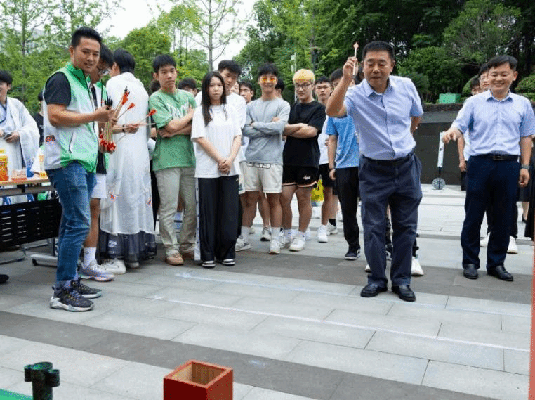 图19 校党委书记马蜂与同学们一起体验趣味投壶的乐趣