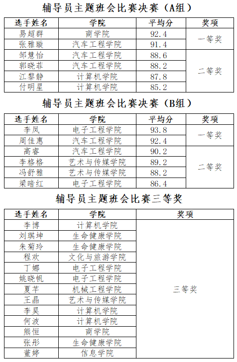 为深入学习领会习近平总书记在学习贯彻习近平新时代中国特色社会主义思想主题教育工作会议上的重要讲话精神,落实《普通高等学校辅导员队伍建设规定》,促进辅导员队伍专业化职业化发展,进一步落实立德树人根本任务,提升我校辅导员的思想政治工作能力和育人水平,根据《关于开展第十二届“我们的旗帜·凝心铸魂奋进新征程”思想政治教育活动月的通知》要求,我校在全校范围内开展第十二届“我们的旗帜”思想政治教育活动月系列活动之辅导员主题班会比赛初赛,并于9月6日举行决赛。决赛共有12名选手入围,分A、B两组同时进行,分组由抽签决定,两组分别决出一等奖2名,二等奖4名。经过选手激烈角逐,最终产生一等奖4名,二等奖8名,三等奖13名,现对比赛结果进行通报。