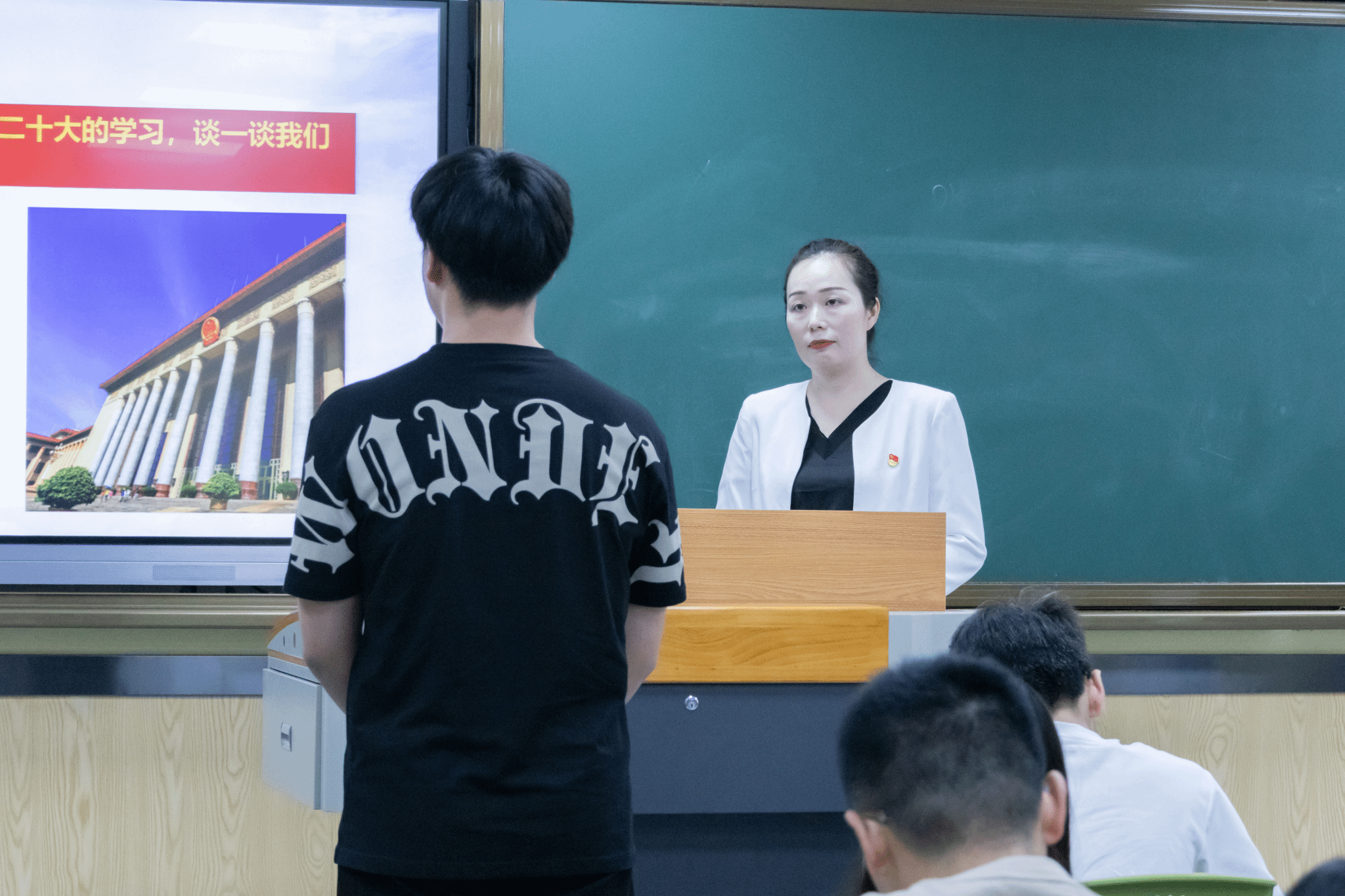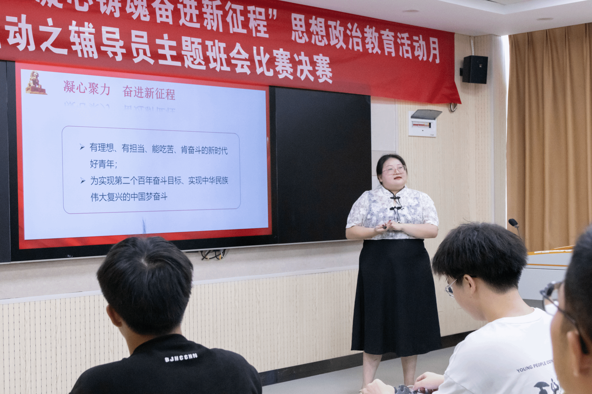 12名参赛选手精心设计班会主题,准确选取切入点召开班会,多思维、多角度、多形式地展示班会教育思路、方法和效果。电子工程学院李凤老师以“凝心聚力共奋进,同心逐梦谱新章”为题,让同学们在讲台上以舞台剧的方式精彩重现《觉醒年代》片段,共同感受家国情怀;商学院易超群老师以“青春逢盛世,拼搏正当时”为题,循循善诱,引导学生从个人情感到精神层面、从小爱到大爱,激发正能量;汽车工程学院周佳惠老师以“成长中的价值选择”为题,在班会现场进行价值拍卖,于欢声笑语中引导同学们树立正确的价值观念与人生态度;汽车工程学院张雅璇老师以“凝心聚力,奋进新征程”为题,让同学把写有梦想的纸飞机放飞空中,引导学生立志成为有理想、有担当、能吃苦、肯奋斗的新时代好青年。比赛现场气氛热烈,精彩纷呈,掌声阵阵。