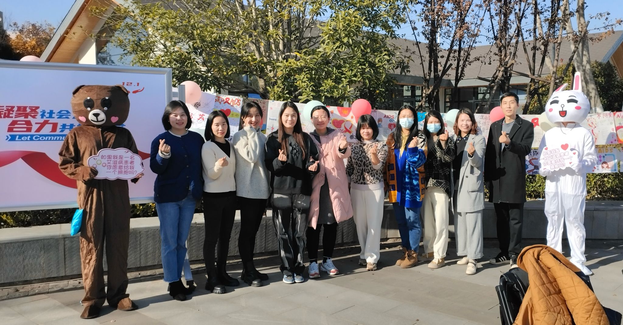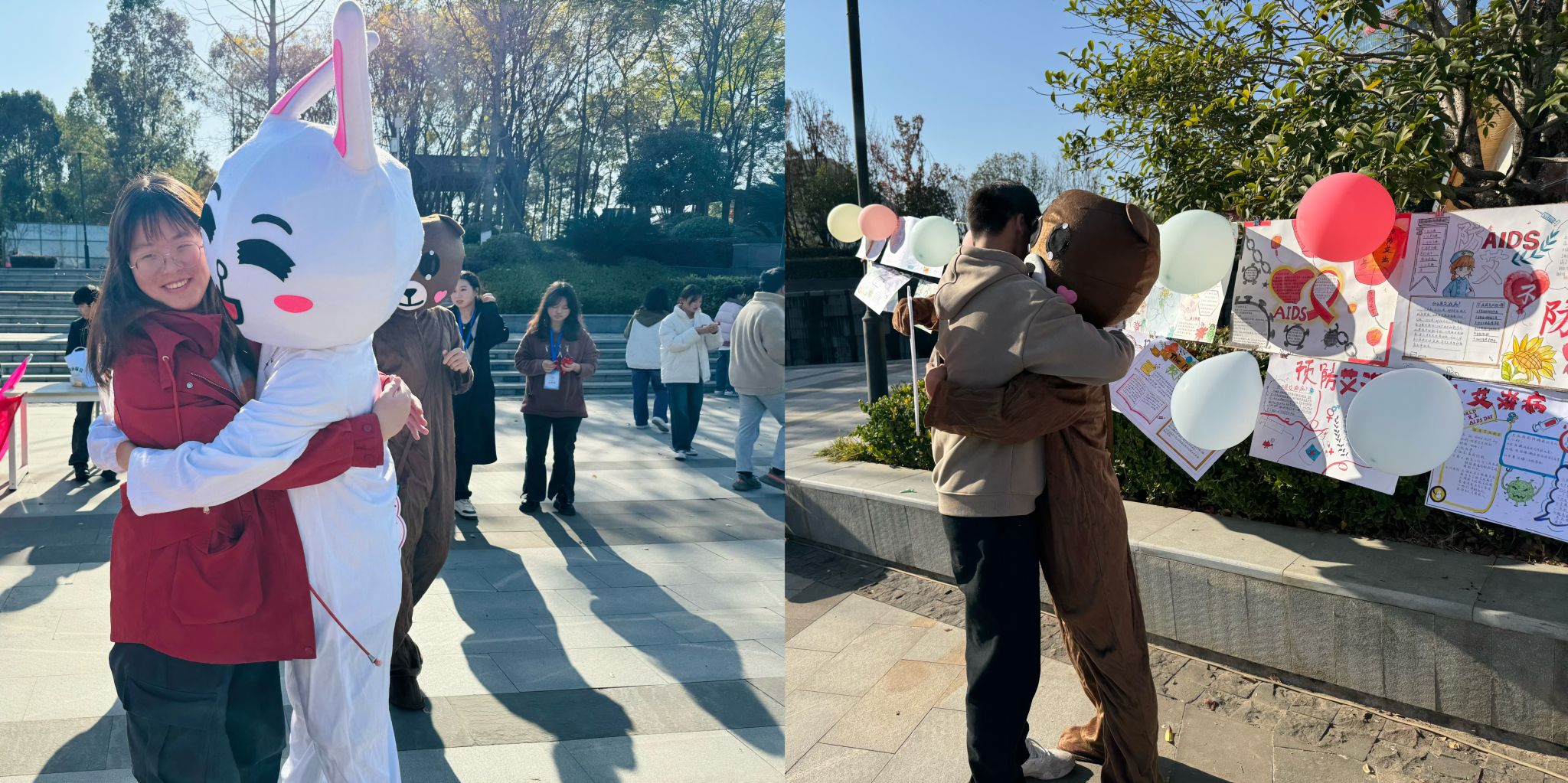 为了消除社会对艾滋病病人的歧视和偏见,营造健康和谐,互相支持的校园环境,机械学院和体育学院联合举办了“爱的拥抱”活动,志愿者身着卡通装,手举“我是艾滋病病毒感染者,您愿意给我一个拥抱吗?”的字牌,以玩偶温暖抱抱的方式告诉大家,与艾滋病病毒携带者日常的拥抱和亲吻并不会传染,我们应该与身边的“他(她)”友好共处。