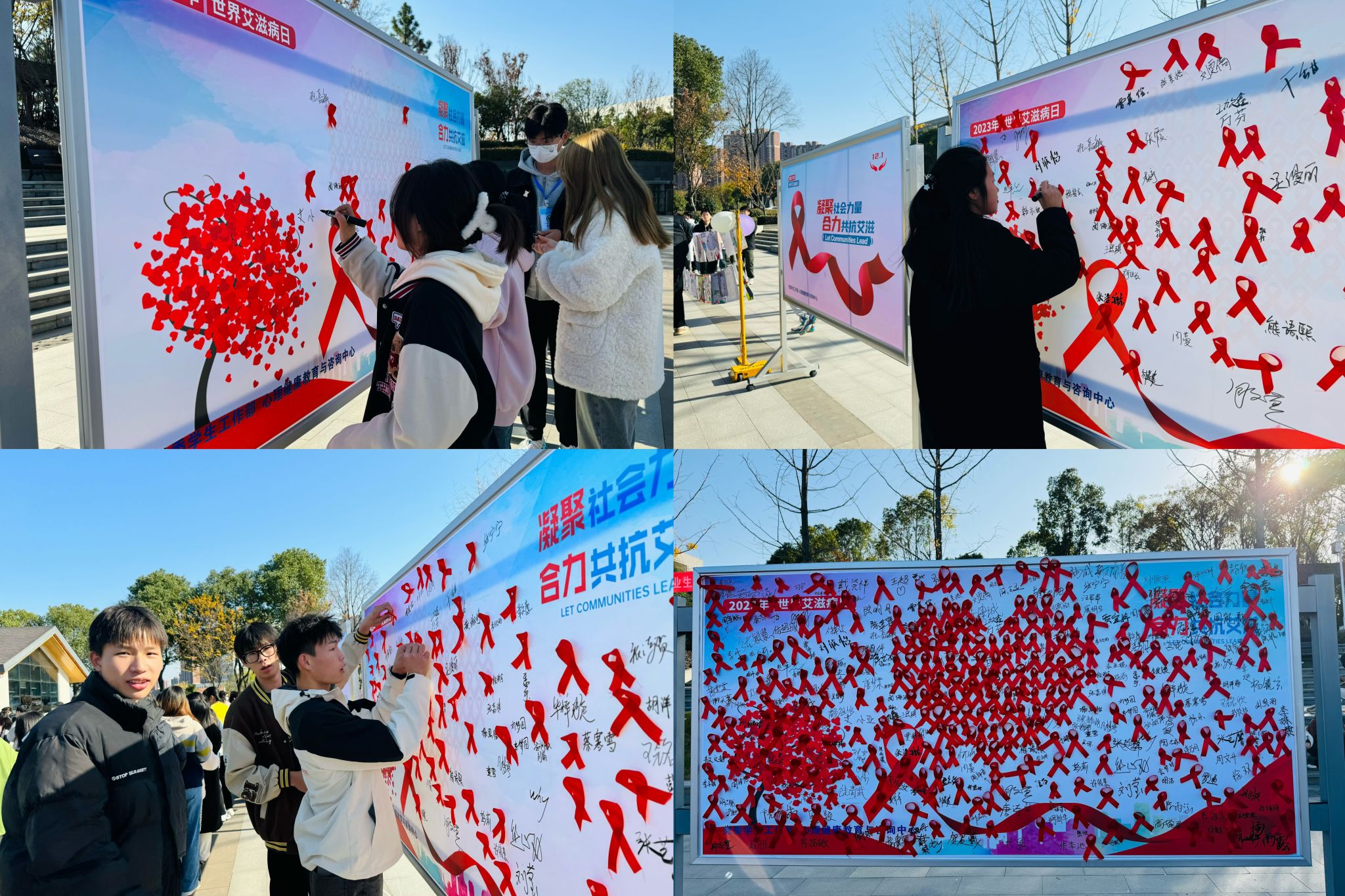 同时,商学院、文旅学院和生命健康学院开展爱的签名和贴红丝带的活动。活动现场,红丝带在同学们手中传递,伴随着他们的鼓励与祝愿,红丝带贴满了整个宣传墙,传达着同学们对艾滋病患者的关心和鼓励。签名活动也得到了同学们的积极响应,在路过签名墙时纷纷驻足,郑重签下自己的姓名,表达了对防艾工作的支持和决心。