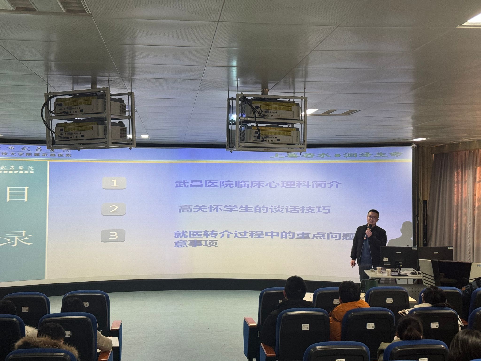 12月21日上午,我校邀请武汉市武昌医院临床心理科副主任张立国开展“高关怀学生就医转介过程中的重点问题及注意事项”专题讲座。讲座由党委学工部副部长张胜洪主持,各学院分管学生工作的领导、专兼职辅导员、心理联络员、后勤管理处和保卫处部分工作人员、心理中心全体教师参加。
