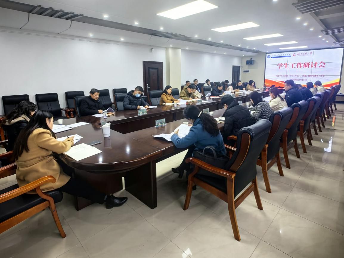为进一步落实立德树人根本任务,推动学生工作高质量发展,12月10日下午,我校2024年十二月份学生工作研讨会在综合楼三楼会议室召开。校党委书记马蜂出席并讲话,党委学生工作部、团委、招生与就业工作处负责人,二级学院党总支书记及副书记参加会议。