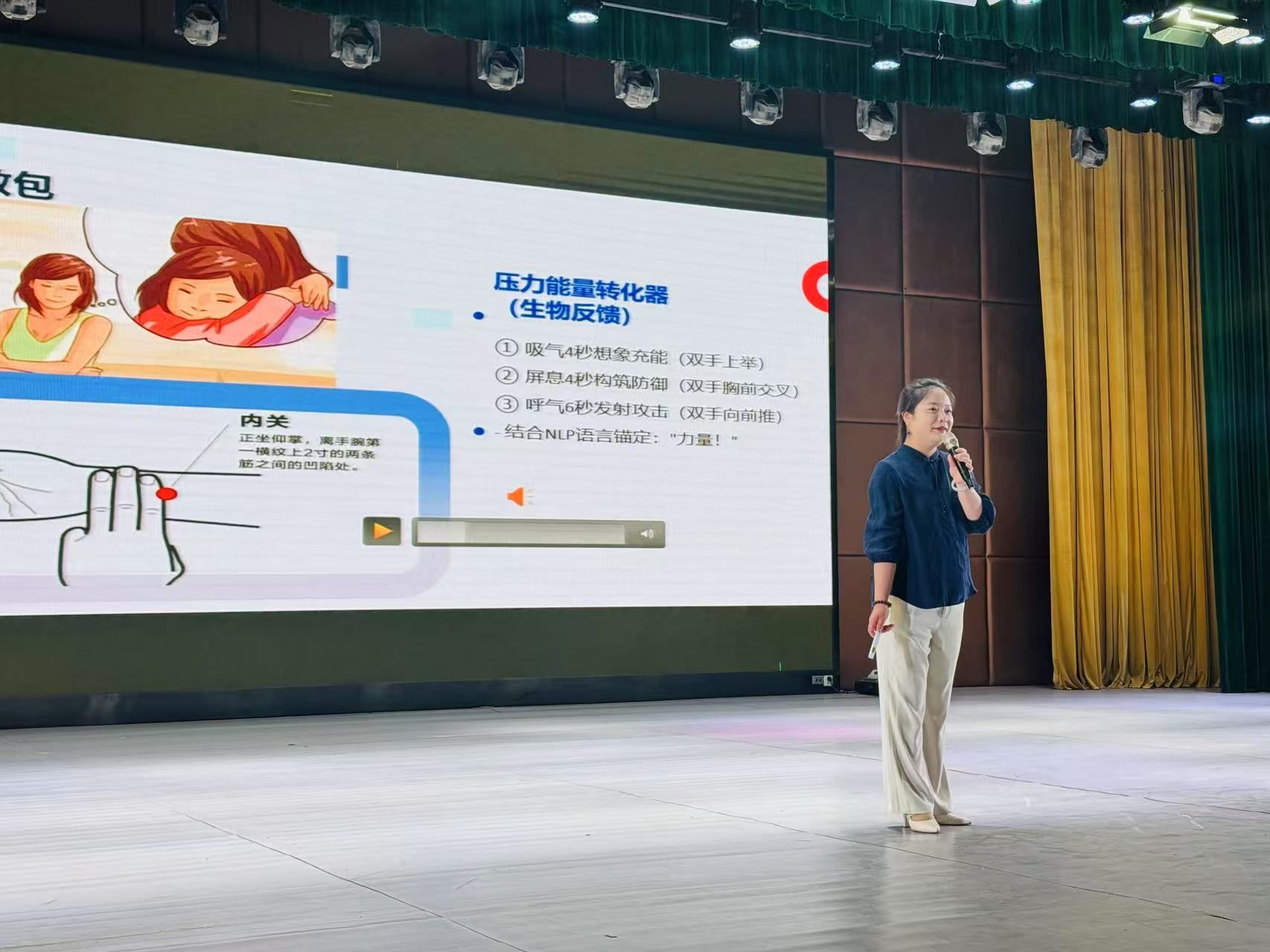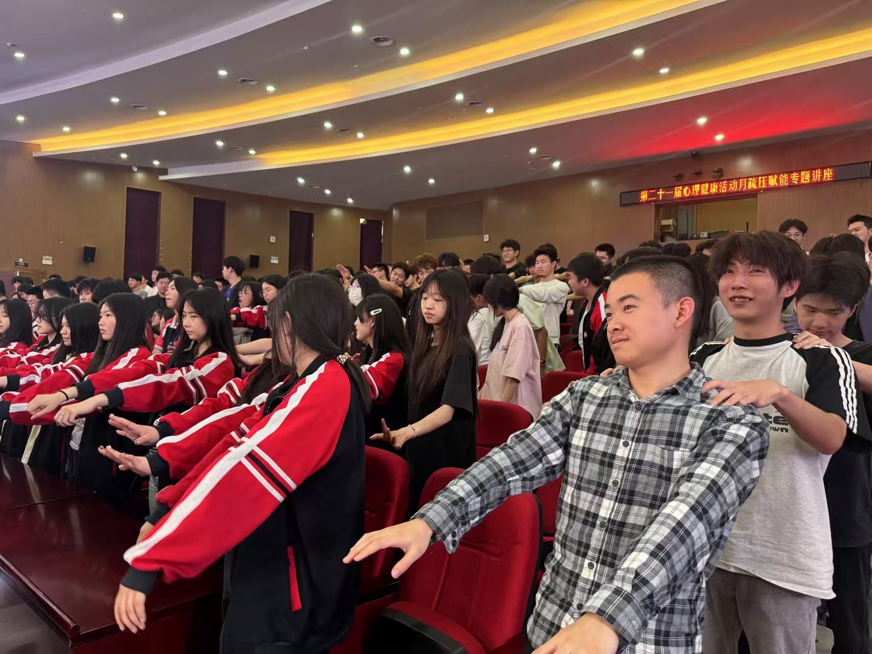 理论讲解结束后,学生们迎来了精彩纷呈的体验环节。在 “压力信号大侦探”活动中,学生们通过握拳、跺脚、对视等方式,亲身体验身体对压力的反应,感受压力在身体上留下的 “痕迹”;“压力蹦迪区”则充满了趣味性,肩部电流舞、手指击剑战等活动,依据神经科学原理调节边缘系统,帮助学生在欢乐中释放压力;“压力能量转化器”结合 NLP 语言锚定,让学生在吸气、屏息、呼气的过程中,将压力转化为动力,激发内心潜能。
