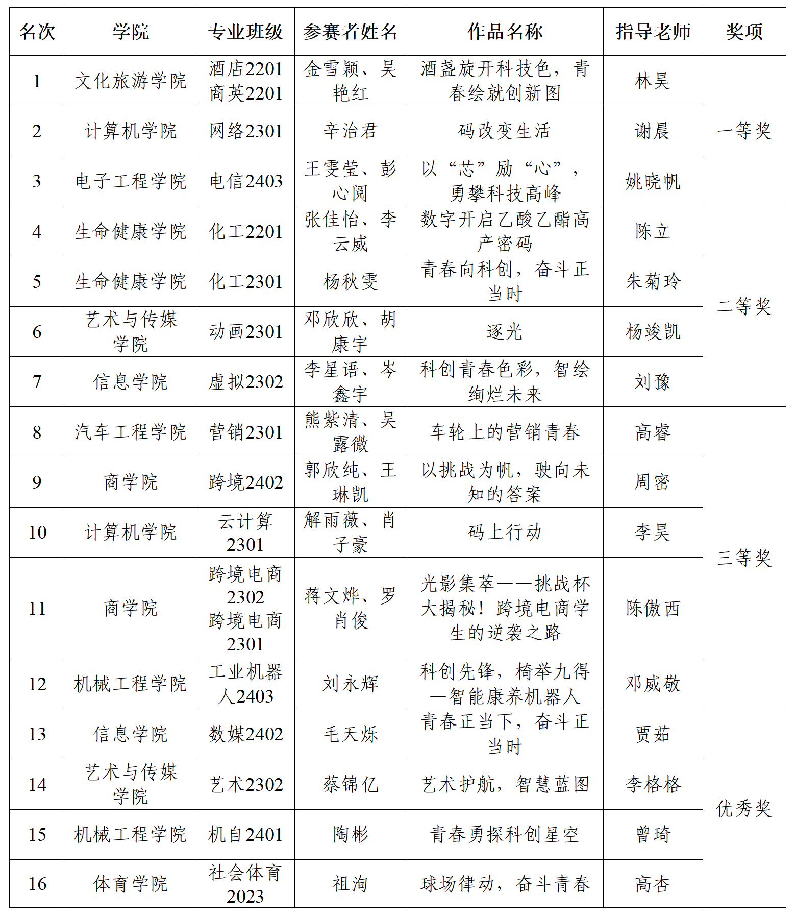为深入学习贯彻习近平新时代中国特色社会主义思想和党的二十大精神,全面实施新时代立德树人工程,引导青年学生提升数字能力素养,树立科技报国志向,培育创新创造能力,根据《关于开展第十四届“我们的旗帜·数字赋能 科技强国”思想政治教育活动月的通知》要求,我校举办了“科创先锋 智绘蓝图”微视频比赛。开赛以来共收到各学院推送的16件优秀作品,经评委细致评审,共评选出一等奖作品3件、二等奖作品4件、三等奖作品5件,优秀奖作品4件,现对比赛结果进行通报。
