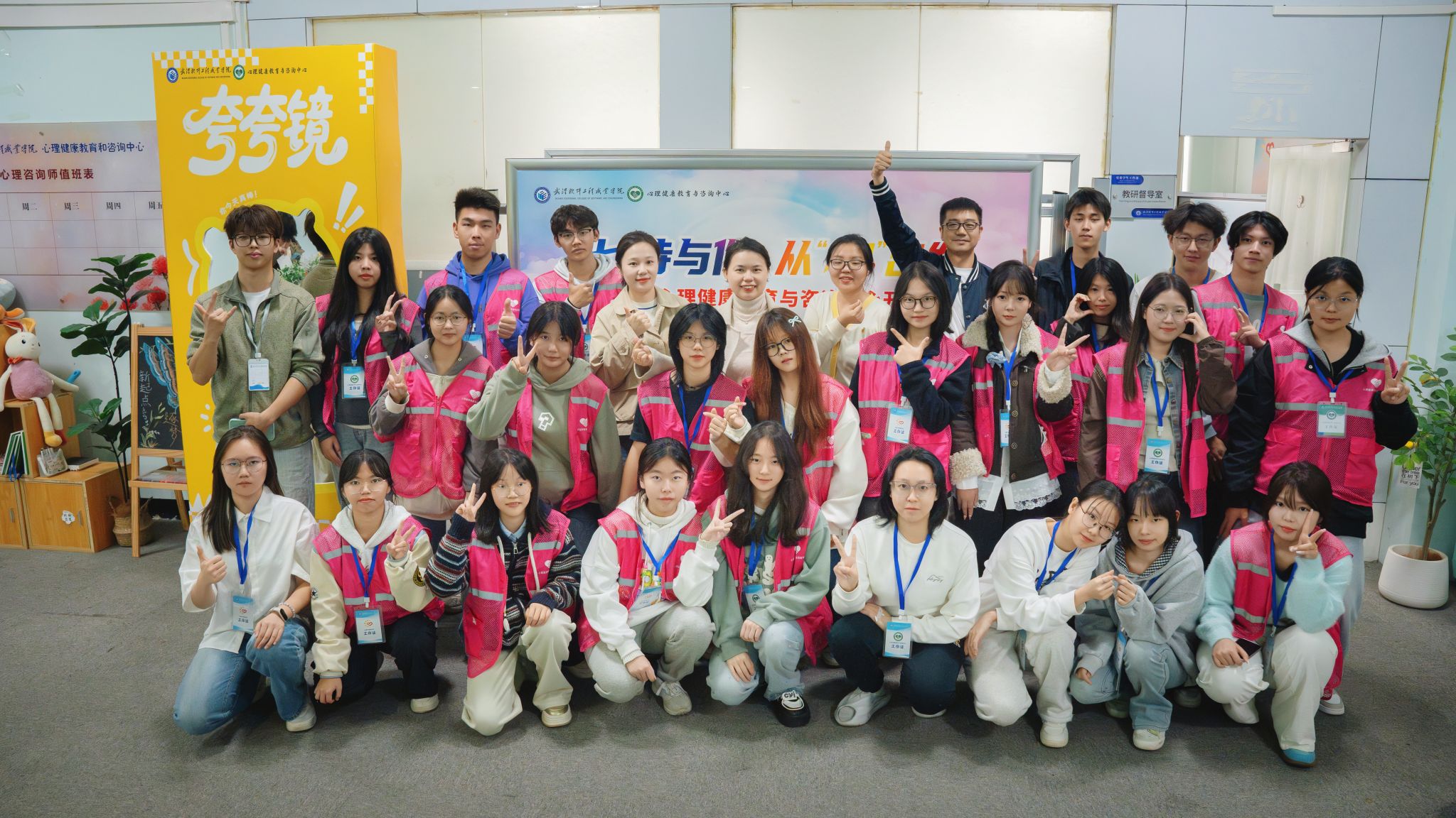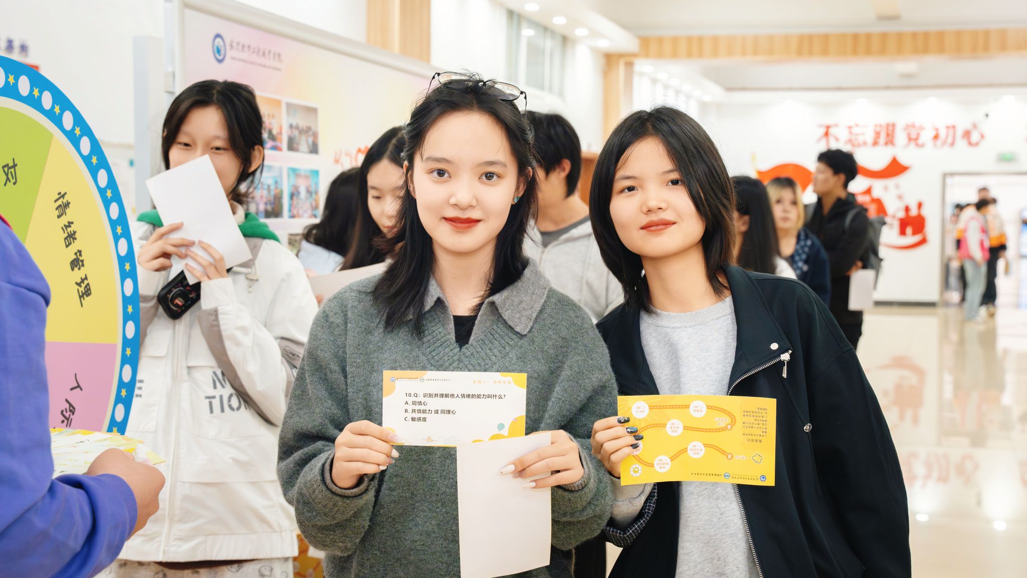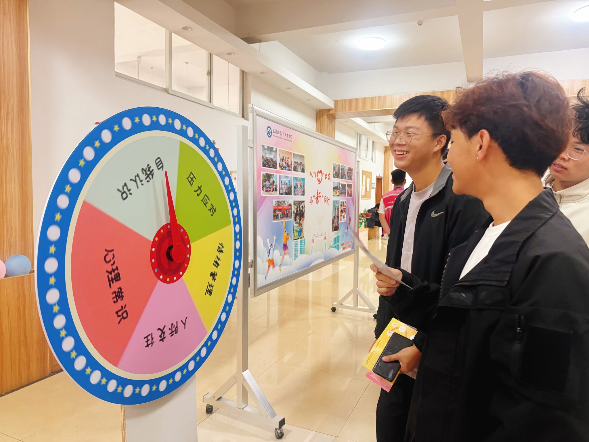活动采用“集章打卡→参与活动→兑换抽奖”的主线流程,在一楼团委大厅、二楼心理中心功能室及特色体验区同步展开,现场气氛热烈,同学们积极参与。
