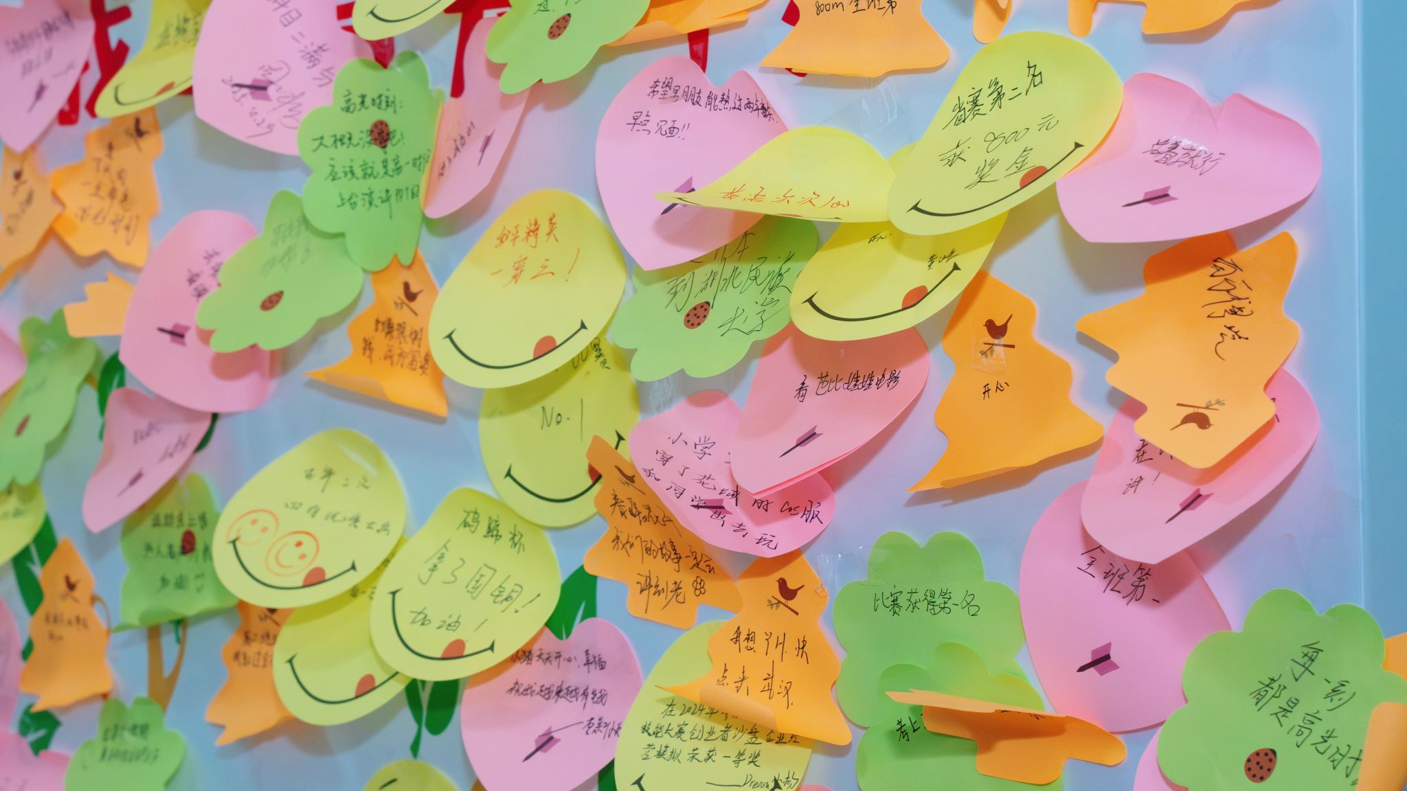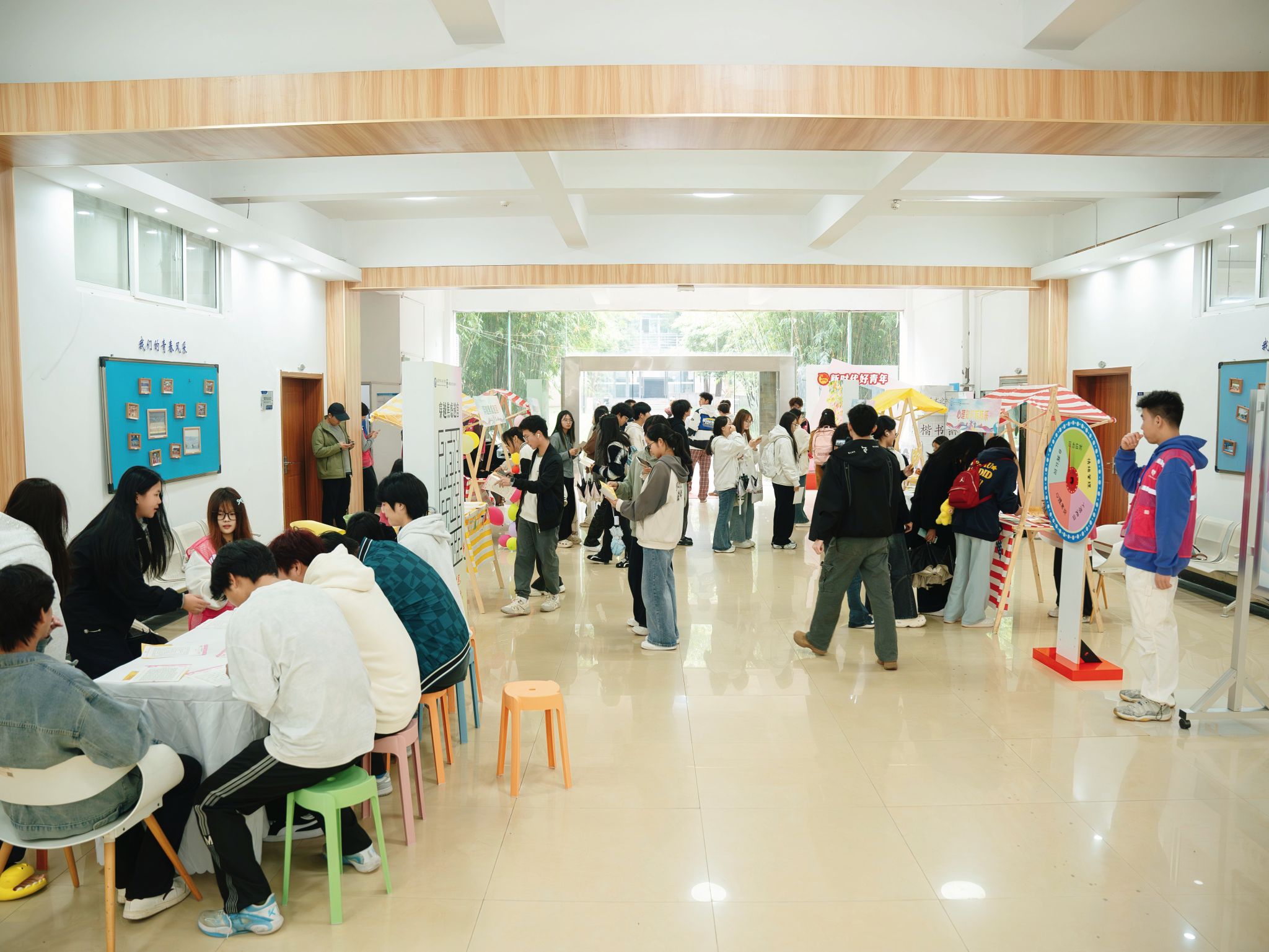 一楼主活动区设置了四大主题摊位,各具特色。“能量树·我的高光时刻”前,同学们将记录个人成功、快乐或被认可经历的彩色便签贴满树枝背景画,共同汇聚成一棵象征积极能量的繁茂大树。