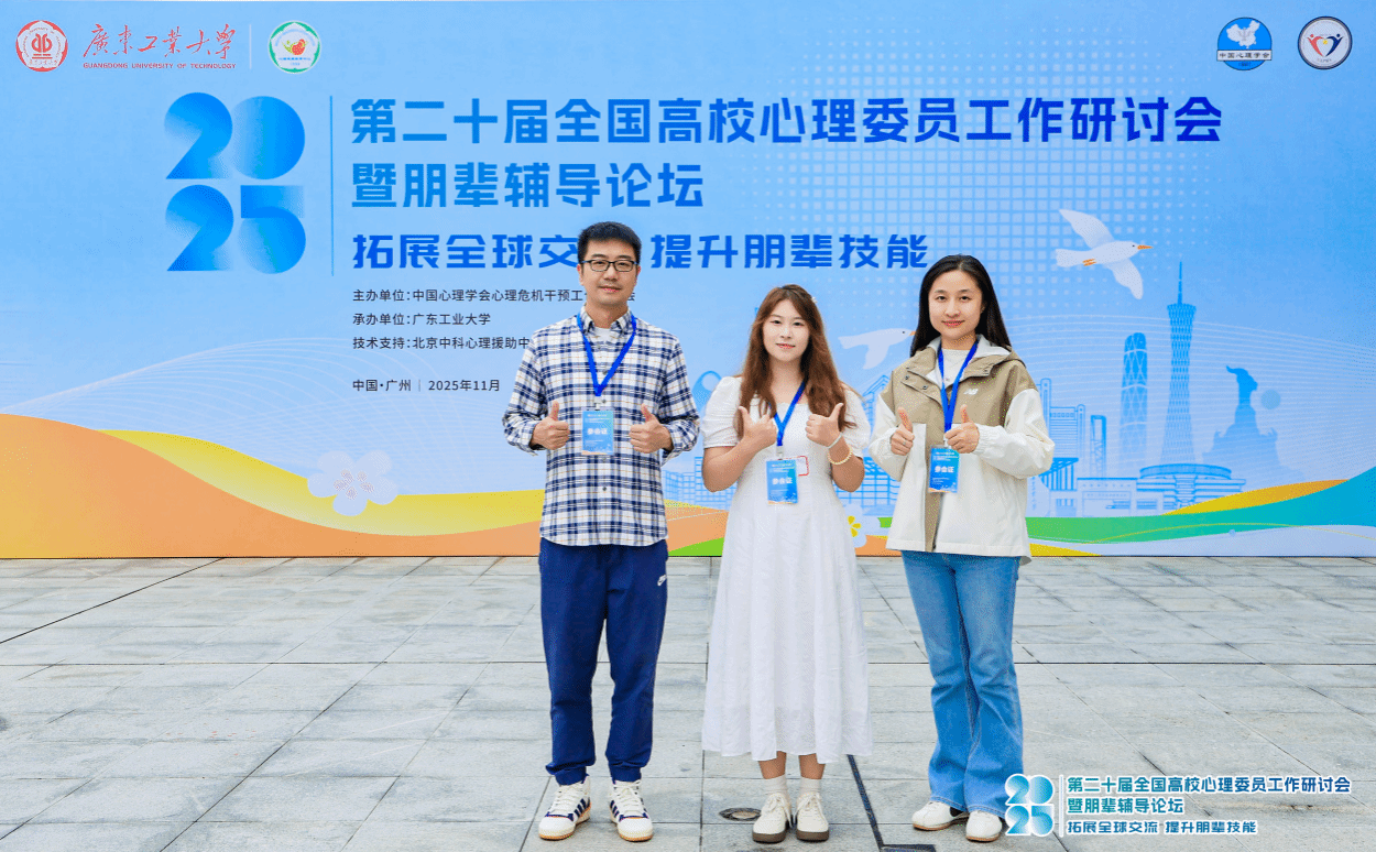 (通讯员 李晖)为加强高校心理委员队伍建设,提升心理委员的专业能力,推动心理委员工作与朋辈心理辅导创新发展,2025年11月5日至7日,由中国心理学会心理危机干预工作委员会主办、广东工业大学承办的第二十届全国高校心理委员工作研讨会暨朋辈辅导论坛在广州顺利召开。我校心理健康教育与咨询中心李晖老师、艺术与传媒学院心理专干冯舒雅老师、艺术与传媒学院心理委员杨静茹代表学校参会。