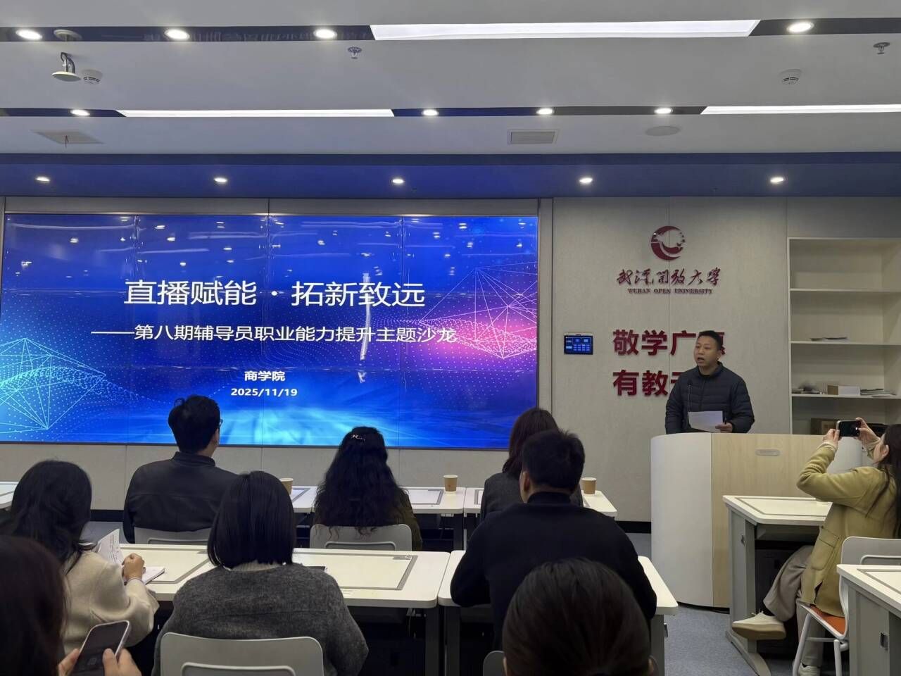 (通讯员 方立)11月19日上午,由学校党委学生工作部主办、商学院承办的第八期辅导员职业能力提升主题沙龙在商学院电商产业学院顺利举行。本次活动以“直播赋能·拓新致远”为主题,聚焦直播电商新业态,探索辅导员队伍建设与育人模式创新的有效路径。