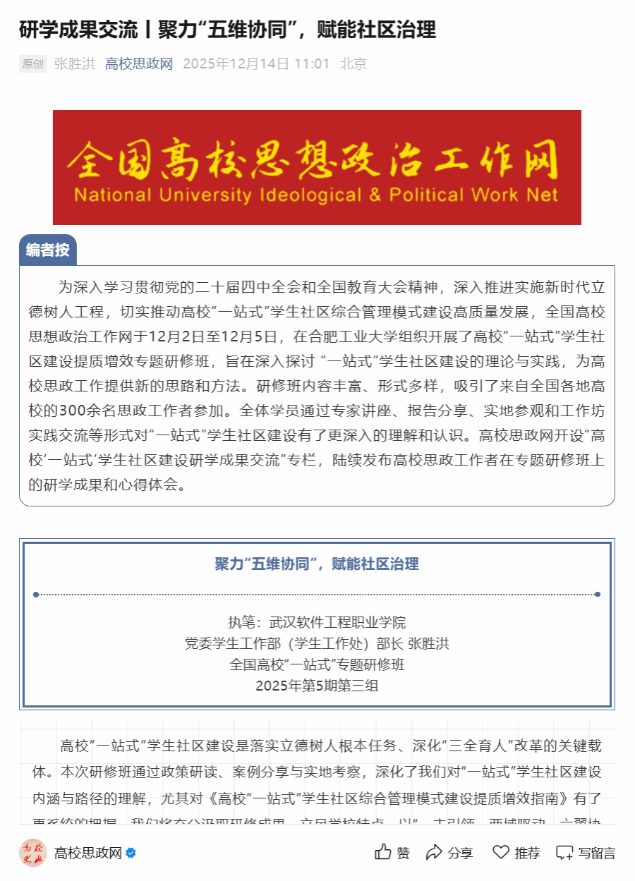 近日,我校“一站式”学生社区建设的研学交流成果,先后在“高校思政网”、“辅导员在线 高等教育出版社”公众号上报道。