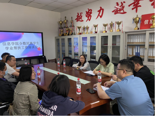 (通讯员:蔡顺康 梅杰)5月25日中午,信息学院在4419办公室召开少数民族学生学业帮扶工作座谈会,特别邀请信息学院、通识学院、马克思主义学院、体育学院授课教师集中座谈,面对面了解学生学习过程中的表现,存在的问题及解决措施。各位老师踊跃发言、建言献策,针对学生存在的专业名词听不懂,老师上课跟不上,课程内容难以理解等学习障碍提供了可行性意见和建议,比如个性化制定教学计划,授课过程录屏供学生自学,课后一对一学业辅导等,多措并举缓解学生的学习压力和心理压力,帮助学生树立学习自信。