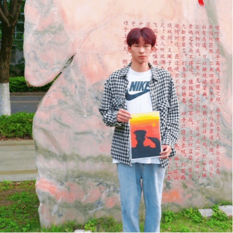 刘学同学的作品以《致敬》为题,用红黑为主色彩描绘边疆战士在日落时敬礼的背影。问及作品灵感来源,他说到:“维护国家安全是指维持和保护国家政权和社会制度的平安、安稳。对于这种安全、脑海中第一时间想到的是边关战士们。他们背负着党的使命和群众的信任,在边关坚守。一顶军帽,顶着祖国的重托;一杆钢枪,挑着人民的希望;一身绿军装,裹着钢铁长城般的血肉身躯。他们永远值得我们致敬!”