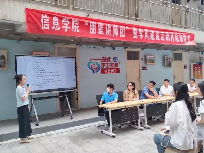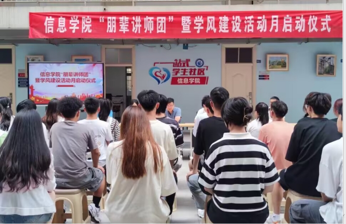 (通讯员:梅杰)6月7日下午5:00,信息学院在12栋一站式学生社区举行朋辈讲师团暨学风建设活动月启动仪式,学院党总支副书记张胜洪、学生科长、辅导员老师及41名朋辈讲师团成员共同见证这一时刻。