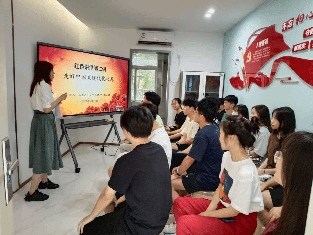 (通讯员:梅杰)6月14日下午5:00,信息学院红色讲堂第二讲在12栋一站式学生社区101室顺利开讲,马克思主义学院专任教师、信息学院兼职辅导员程志颖老师为18名入党积极分子带来“走好中国式现代化之路”的专题讲座。