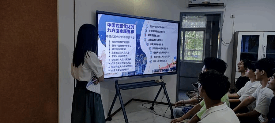 程老师首先抛出两个问题:什么是现代化?现代化有标准吗?在场同学陷入深深的思考,随即进入互动问答环节,纷纷给出自己的观点和看法,在这种轻松愉悦的氛围中引出本次授课的主要内容:中国式现代化从何而来,中国式现代化有何特征,中国式现代化从何实现。在老师的带领下,同学们学习了中国式现代化从被动到主动的心路历程,理解了中国式现代化为什么是人口规模巨大的现代化、全体人民共同富裕的现代化、物质文明和精神文明相协调的现代化、人与自然和谐共生的现代化、走和平发展道路的现代化,明确了走好中国式现代化之路九个方面的本质要求。