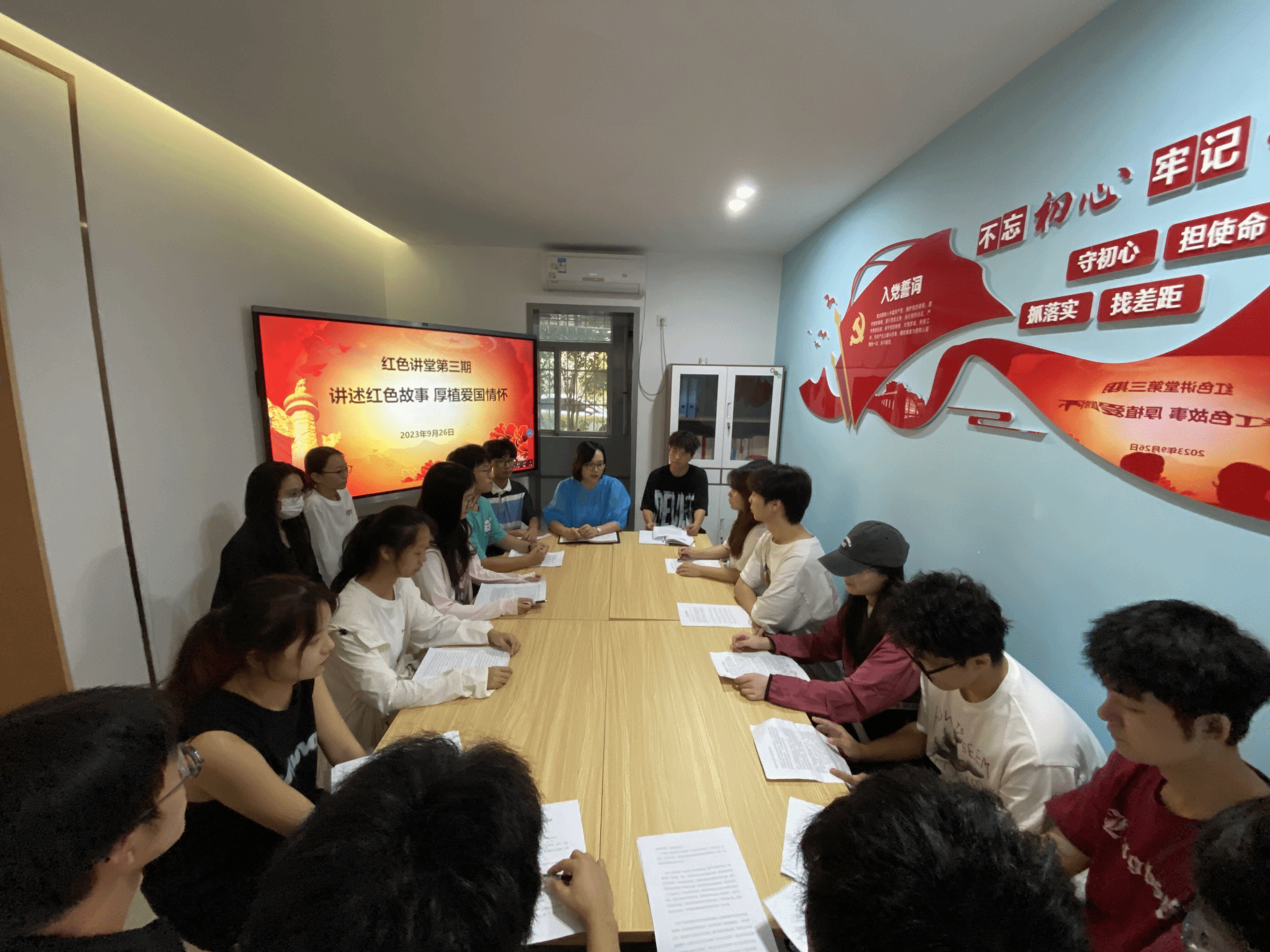 (通讯员:蔡顺康)2023年9月26日下午5:00,为庆祝伟大祖国74岁华诞,弘扬爱国主义精神,信息学院在12栋一站式学生社区101室举办红色讲堂第三期学习教育活动,本期以“讲述红色故事 厚植爱国情怀”为主题,由每位参与的学生作为主讲人,与大家共同分享红色故事及其对爱国主义的所思所想所感所悟,学生科科长、学生党支部书记梅杰老师,大二年级辅导员、学生党支部组织委员蔡顺康老师带领18名入党积极分子共同参加学习。