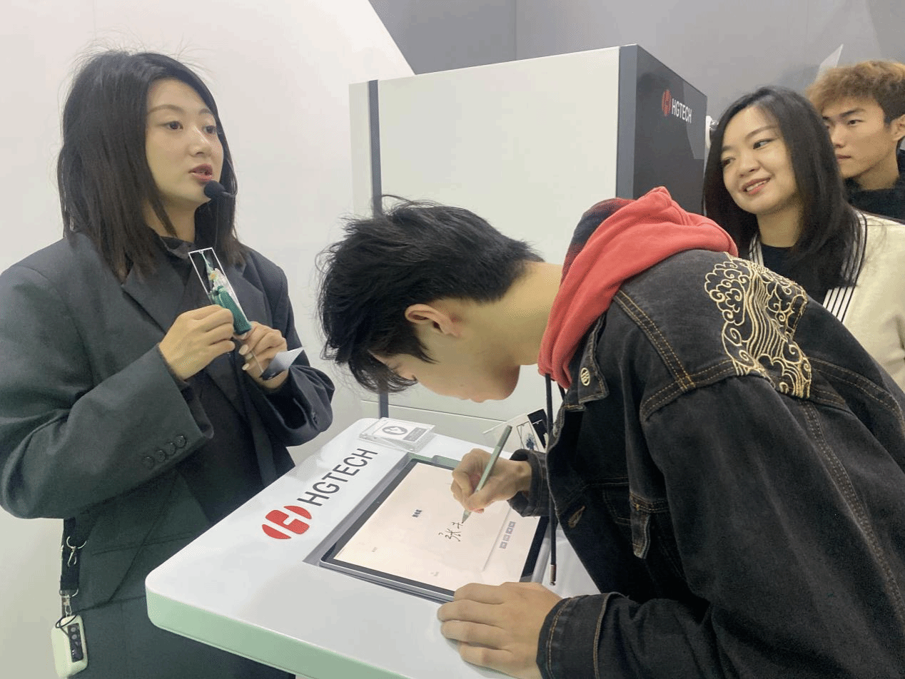 最后,讲解员邀请知识竞答优秀的张超同学体验激光打印的魅力。张超同学现场用电子笔签名后传送至礼品制作装置上,不到一分钟的时间,由激光加工而成的精美小礼品就已经包装完毕。现场师生们都被礼品制作的速度和精美程度所震撼,真切地感受到了高新技术发展带来的独特魅力。
