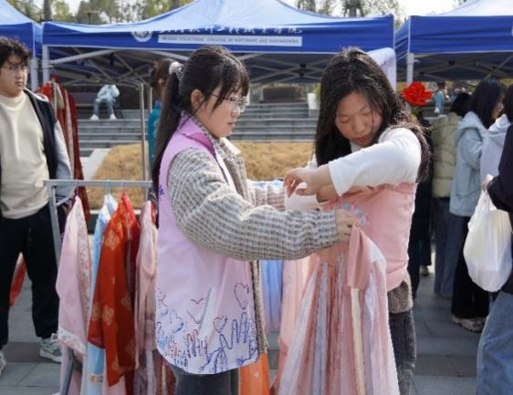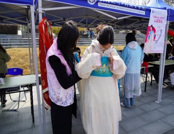 (志愿者在帮助同学们穿汉服)