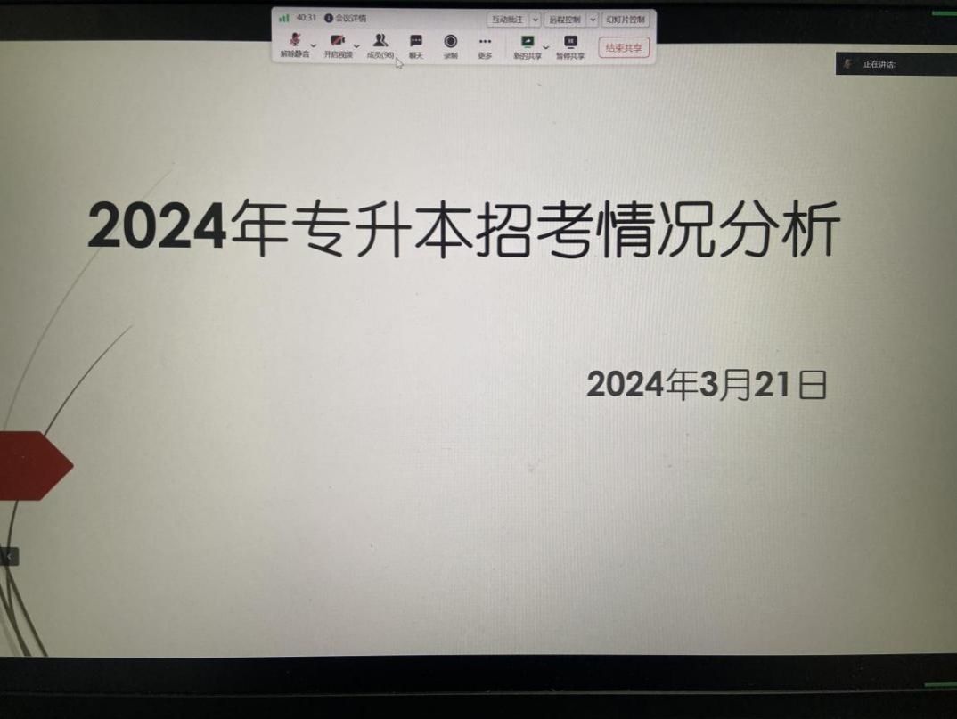 会上杨晓龙老师就2024年湖北省专升本招考情况、艺术与传媒学院近三年考录情况进行了交流。李建强教授针对同学们关心的专升本问题,详细解读了备考、报考注意事项,强调一定要合理规划,做好学习计划。武汉东湖学院、湖北商贸学院老师代表就本校2024年招生计划、报考资格、复习策略等问题进行宣讲。