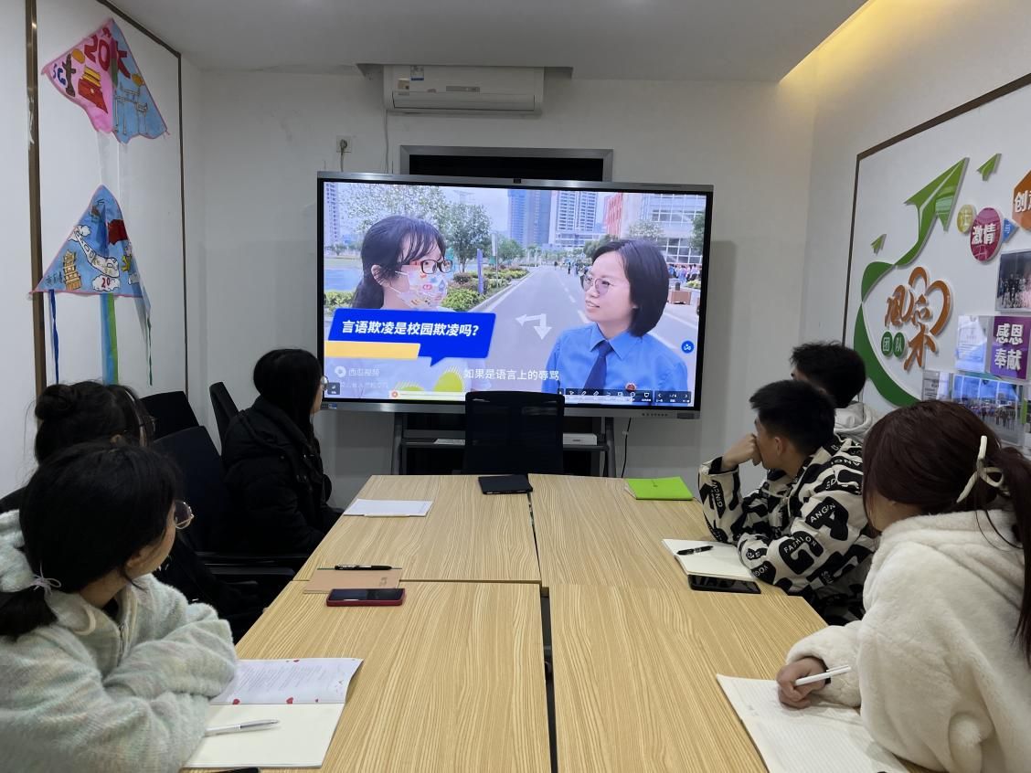 辅导员首先与心理委员进行了交流座谈,围绕着大学生心理健康、校园霸凌两个主题展开,朱老师强调了学生心理健康的重要性,明确了心理委员的职责,鼓励心理委员积极带领班级同学参加学校的各项心理活动。会后组织全体心理委员观看心理健康公益短视频、校园霸凌短视频。结合视频中的情节,大家对常见的心理健康问题、校园霸凌话题展开了分析讨论,朱老师适时对同学们加以引导。