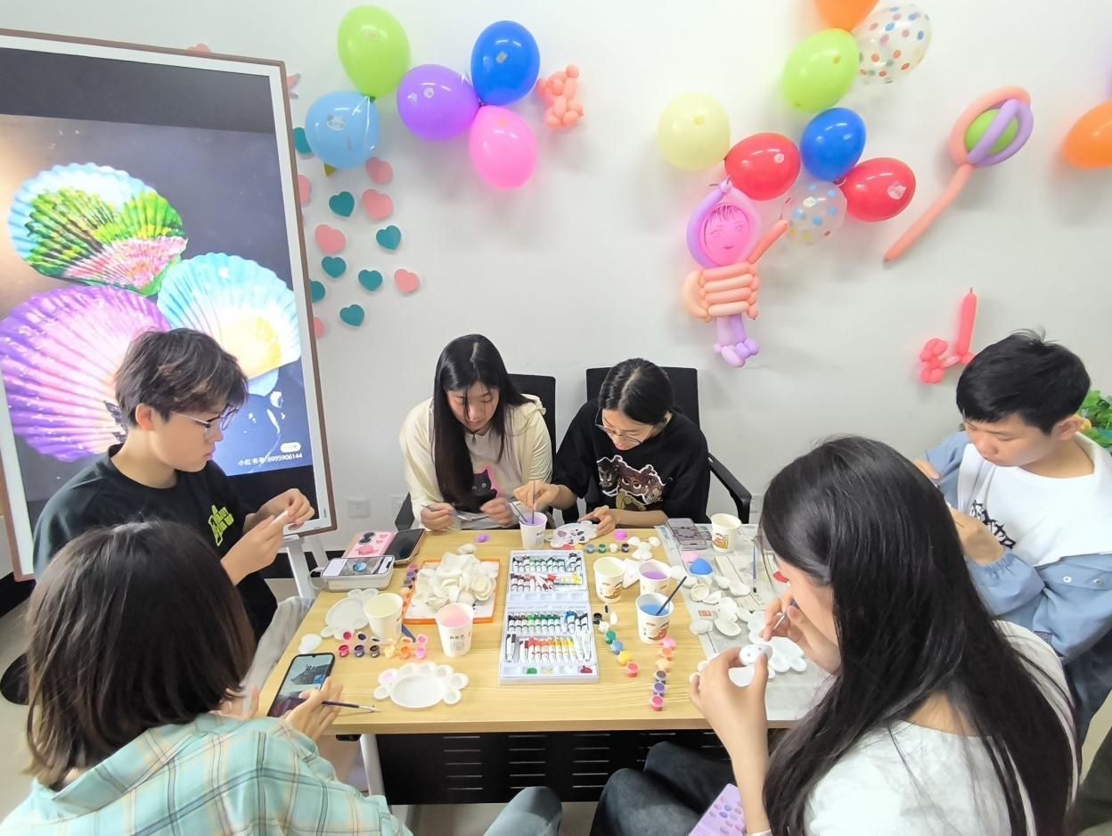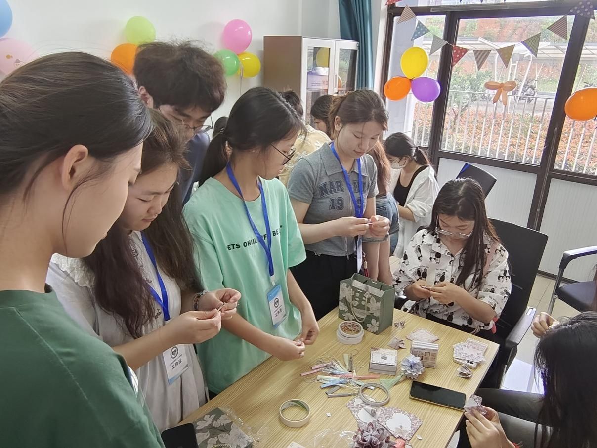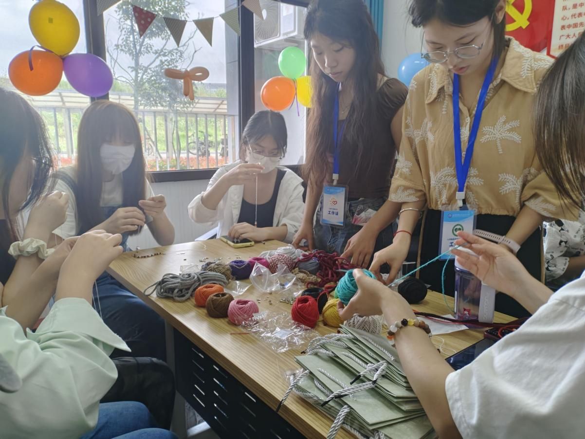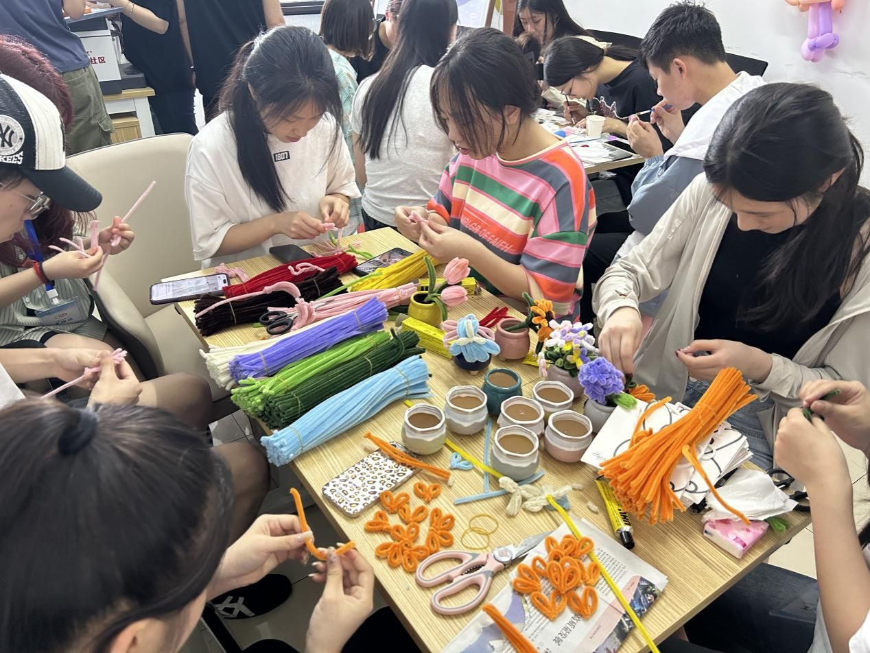 接下来,同学们进行简短的自我介绍,并随机分为四个手工制作小组,分别是扭扭棒盆栽组、创意手链组、贝壳画组和手工花球组。扭扭棒盆栽和创意手链能够充分发挥同学们的想象力和创造力,贝壳画可以折射出作者的所思所想,制作花球则考验自身的细心和耐心。这些小手工的制作,充分发挥了同学们的动手能力,进一步释放了心理压力,也促进了同学间的沟通交流,大家脸上洋溢着开心的笑容。