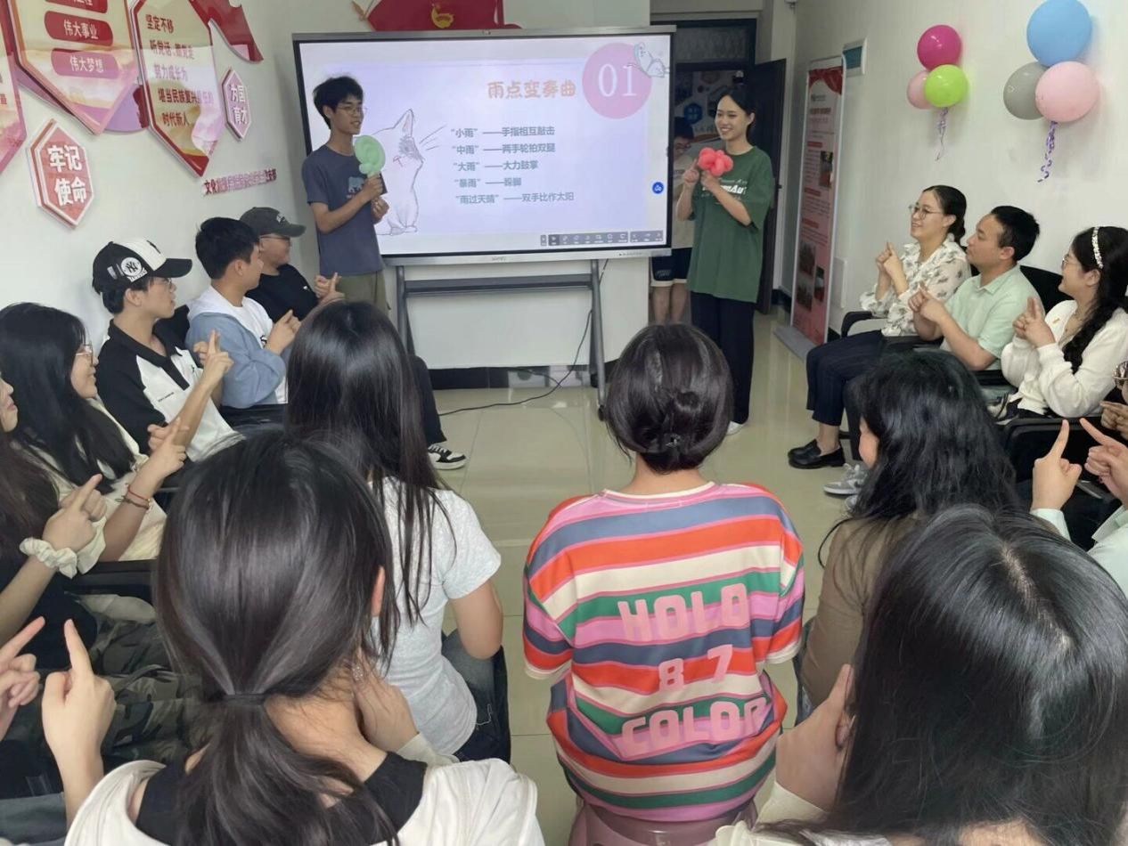 开场环节,主持人带领同学们进行热身游戏——“雨点变奏曲”,在增强注意力的同时,也让现场氛围更加轻松和活跃,引导大家积极投入活动中。