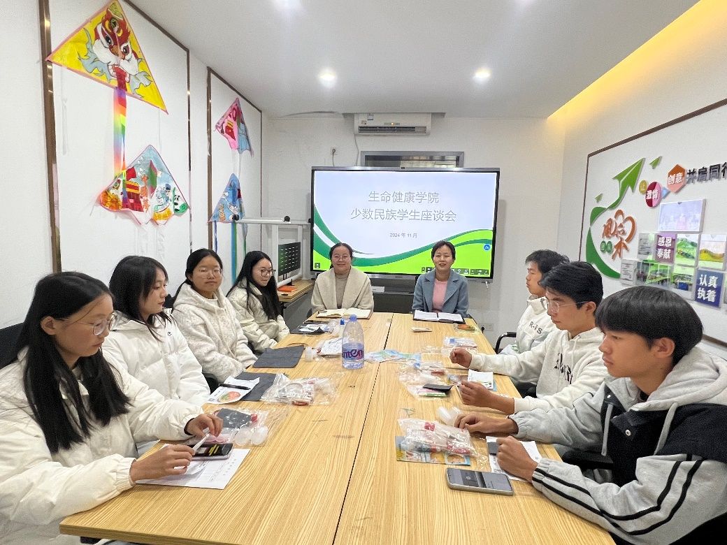(通讯员:张彤)为深入了解少数民族学生在校生活学习情况,倾听少数民族学生的心声,不断强化管理育人、服务育人的针对性与实效性,进一步增强学生的归属感和幸福感,生命健康学院于2024年11月27日下午在8栋“一站式”学生社区召开了少数民族学生座谈会。学院党总支书记叶志娟、学生科科长唐圆、学生辅导员张彤及2024级少数民族学生代表参加了本次座谈会。