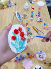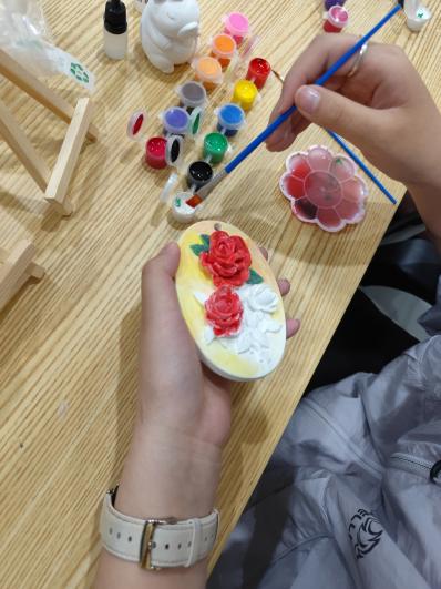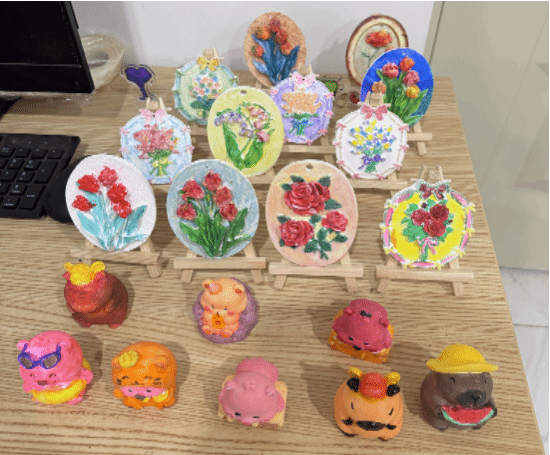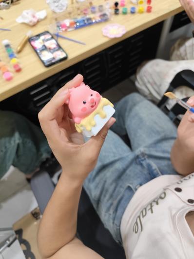 活动现场,五彩斑斓的颜料整齐排列,形态各异的石膏模型静待同学们赋予它们新的色彩。大家围坐在一起,挑选着自己心仪的石膏模型,或沉思构图,或大胆挥笔,沉浸在创作的世界中。有人专心画着鲜艳花朵,一笔一笔勾勒出花瓣枝叶,花朵很快就在物件上绽放;有人精心打造可爱动物,添上灵动眼睛、俏皮耳朵,小动物仿佛随时能蹦跶起来。不管是淡雅风还是浓烈风,每一件作品都超有创意,满是创作者的独特想法。