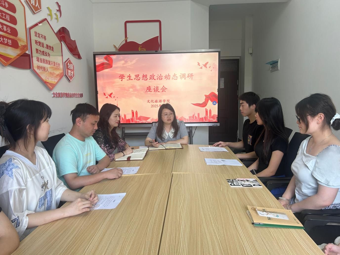 (通讯员:程欢)为深入了解学生思想政治状况,进一步增强思想政治教育工作的针对性与实效性,切实提升学生管理与服务水平,6月6日下午,文化旅游学院在18栋“一站式”学生社区党员活动室举办学生思想政治动态调研座谈会。学院党总支副书记赵珊、学生管理科副科长宋玲琪、辅导员林昊、程欢老师以及各年级入党积极分子、预备党员学生代表,齐聚一堂,围绕学生政治认识、价值观念、学习生活、时政热点和日常教育等核心议题展开深入交流与探讨。