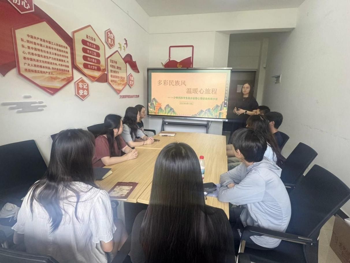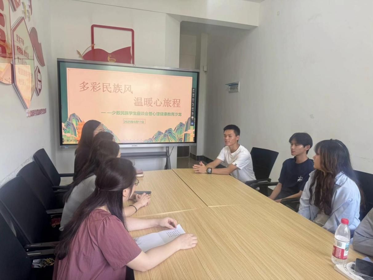 (通讯员:杨薇,摄影:陈梦荣)6月17日,文化旅游学院在18栋“一站式”学生社区开展了少数民族学生座谈会暨心理健康教育沙龙活动。学院党总支副书记赵珊、学生科副科长宋玲琪和辅导员们与来自土家族、苗族、壮族、仡佬族等多个民族的同学相聚一堂,在文化交融与创意实践中,开启了一段独特的心灵之旅。