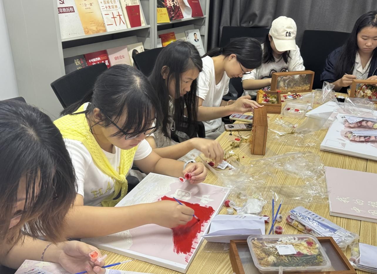 手工赋情,释放创意活力。随后的60分钟手工创作环节,成了同学们的“创意秀场”。大家可自由选择“红色石英砂肌理画”“《盛世华诞》永生花相框”。有学子初接触石英砂,不知如何调色,一旁的志愿者立刻上前指导。永生花创作区里,有人把永生花剪成五角星形状,有人在相框边缘粘金色丝带,现场热闹却不嘈杂,满是专注与欢喜。