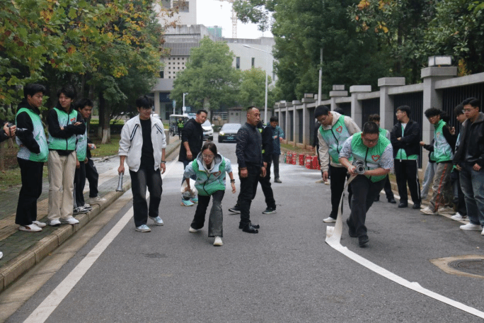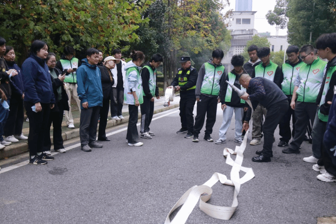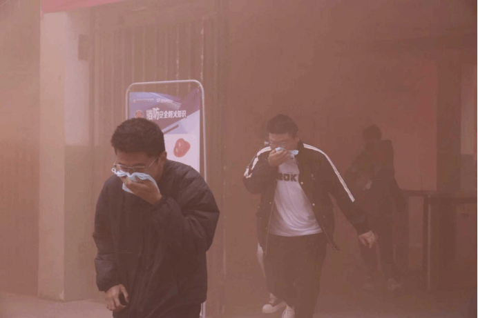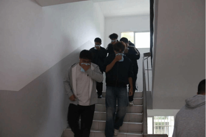 急促的消防警报声准时响起,演练正式拉开帷幕。学生公寓16栋内,模拟烟雾缓缓弥漫,参演学生反应迅速,立刻拿出提前准备的湿毛巾捂住口鼻,弯腰低姿贴近墙壁,严格遵循“靠右行走、不推不挤”的原则,循着楼道内的指引快速前行。途中,同学们主动避让、相互提醒,辅导员在楼道关键节点疏导秩序,协助照顾动作较慢的同学,整个疏散过程紧张而有序。短短数分钟,所有参演人员便安全撤离至楼外指定集合区域,完成了高效有序的应急疏散。