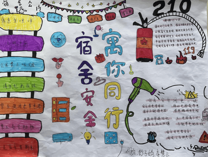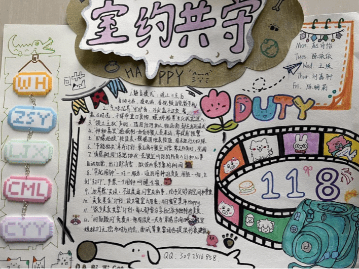 2025级:定制“专属公约”,让文明住宿与心理关怀同频共振。作为刚踏入大学校园的新生群体,2025 级学子以“寝室公约设计”为核心参与活动,将对宿舍生活的期待转化为“文明规范+心理关怀”双维度的行为准则。有的宿舍巧妙融入宿舍特色文化元素,让公约更具个性与辨识度。“心寓心说”以心晴涂鸦为背景,将“团结友爱,互帮互助;暖心相伴,向阳而生”的口号写入公约:“宿舍安全·寓你同行”则在公约边缘绘制简笔画,搭配“消防小口诀;安全用电小口诀”的宿舍理念;还有的宿舍用成员名字的首字母组成专属标识,旁注多项计划和共识:“节能标兵”养成计划、“情感树洞”保密协议、“边界感”共识、“家乡美食共享”计划等,让这份共同约定成为凝聚宿舍情感、守护心理健康的“专属记忆”。还有的针对“考试焦虑、思乡情绪”等常见心理问题,在公约中加入“考前互相分享复习技巧,缓解焦虑;节日时一起准备小惊喜,慰藉思乡之情”的暖心条款,让公约真正成为规范行为、守护安全、关怀心理的“宿舍暖心指南”。