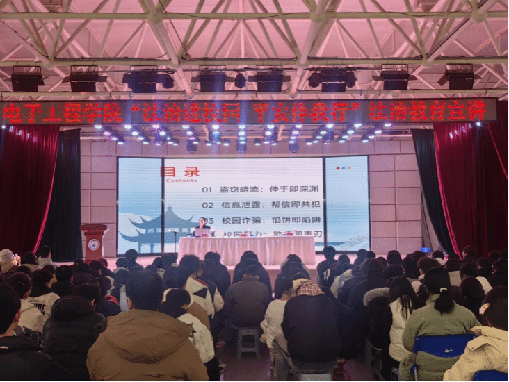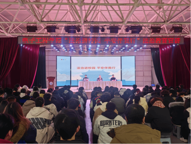 (通讯员:郭健湘 图片:梁暗红 郭秀宇)2025年12月4日下午,电子工程学院联合保卫处在综合楼四楼多功能厅开展以“法治进校园 平安伴我行”为主题的法治教育宣讲活动,学院副院长胡晓勤、学生管理科科长郭健湘及部分辅导员,2025级全体新生、2024级学生干部代表参加。活动特邀同心派出所余涛、闻钰滨警官到场进行专题宣讲,旨在提升在校大学生的法治意识和自我保护能力。