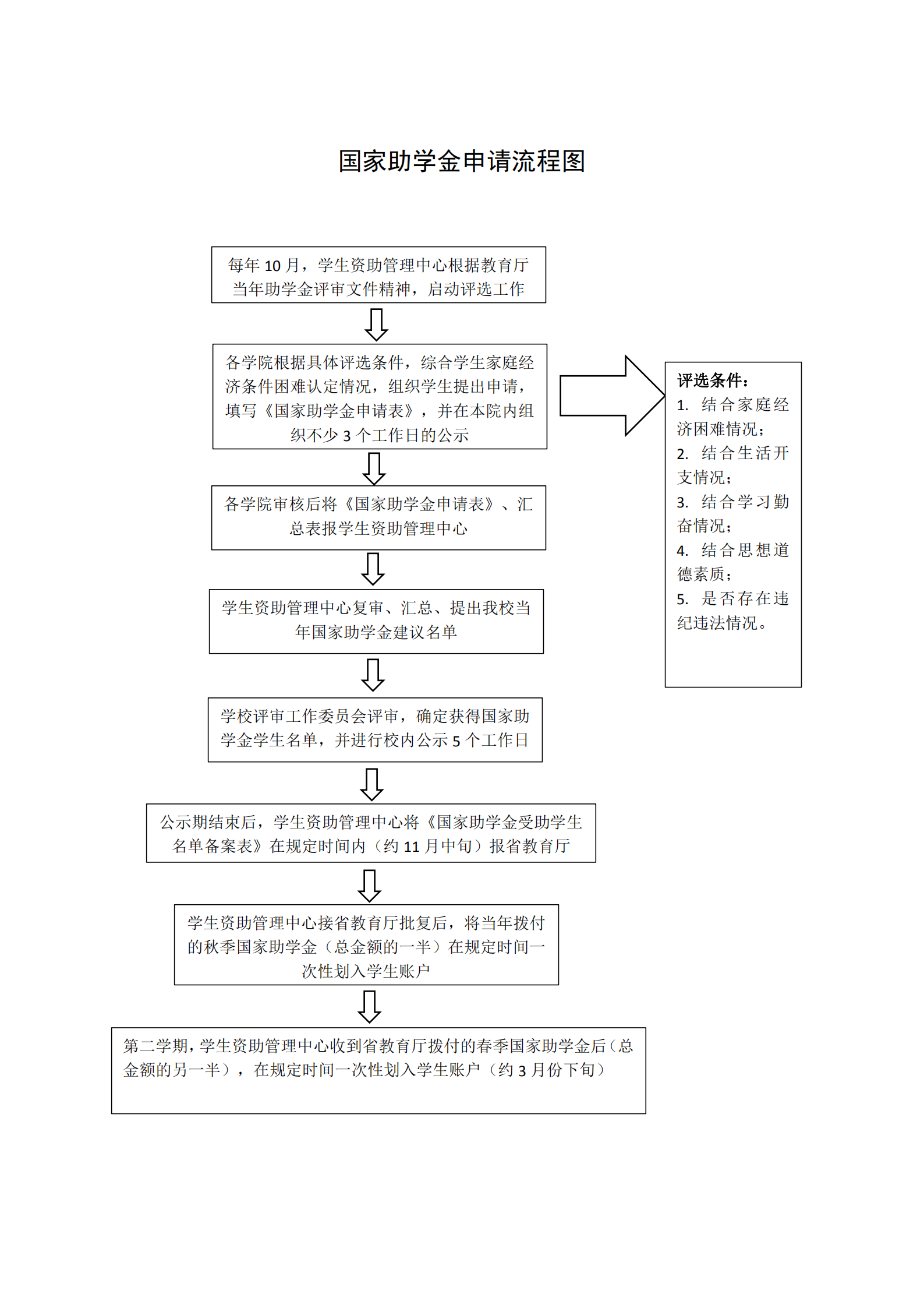 家庭经济困难学生入学后可申请国家助学金,解决在校学习期间的生活费,学生每年10月向学校提出申请,学校每学年评定一次。具体资助标准分设3档,一等为4400元/人年,二等为3300元/人年,三等2200元/人年,分春季(4月)和秋季(12月)两学期发放,每次一半。