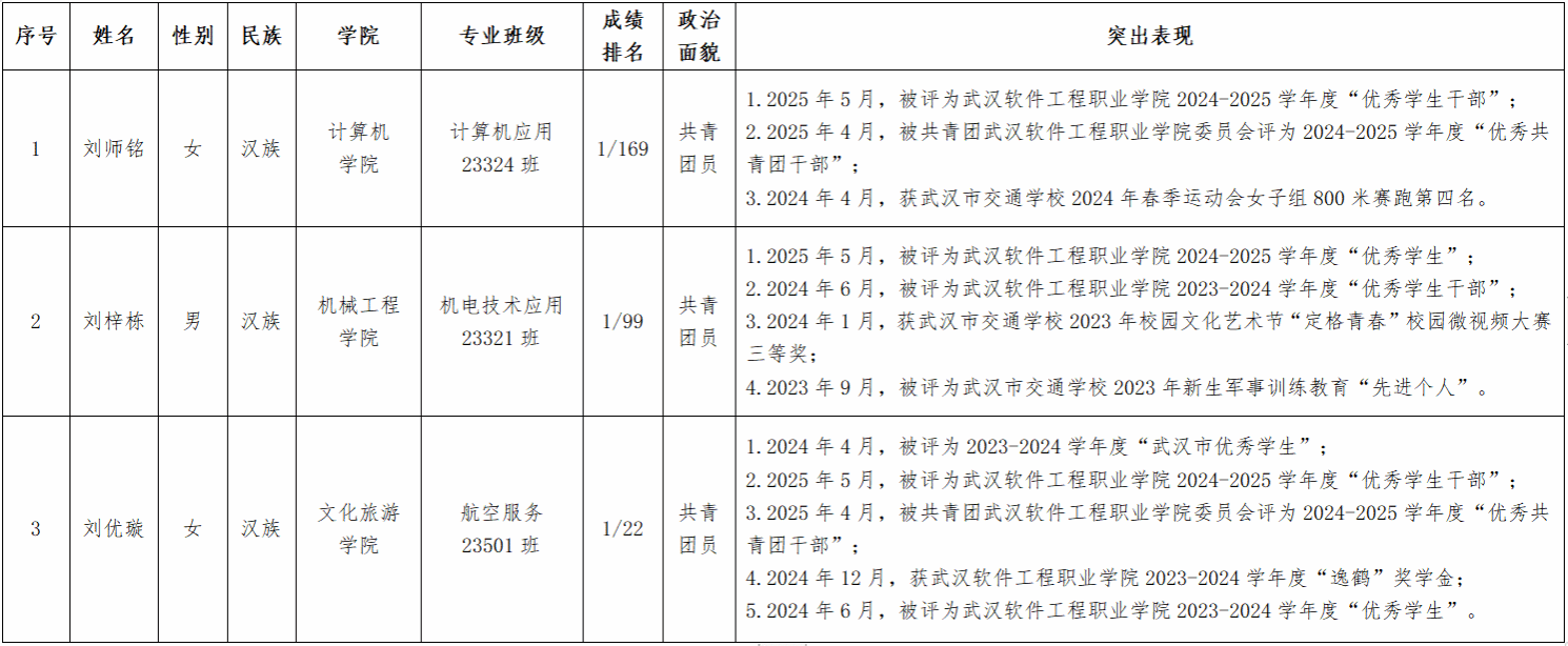 根据全国学生资助管理中心《关于做好2025年中等职业教育国家奖学金评审发放和材料报送工作的通知》及湖北省学生资助管理中心的相关要求,按照公开、公平、公正、择优的原则,在学生个人申请的基础上,经评审确定我校2024-2025学年中等职业教育国家奖学金推荐学生共3人。现予以公示: